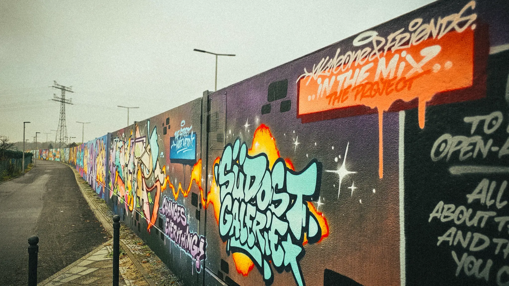 Diese Open-Air-Graffitifläche erstreckt sich über ca. 450 Meter Wandlinie und zeigt urbane Kunst in Vielfalt, Kreativität und Gemeinschaftssinn.